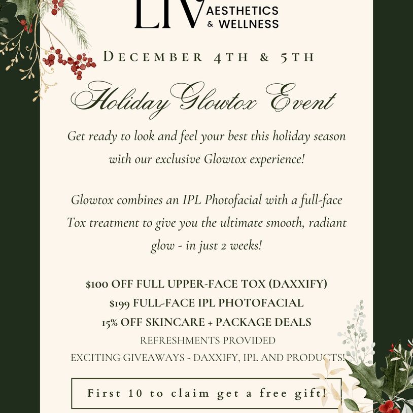You’re invited to our annual GlowTox event! Say goodbye to dark spots, redness, wrinkles, & small spider veins and hello to a fresh new glow.